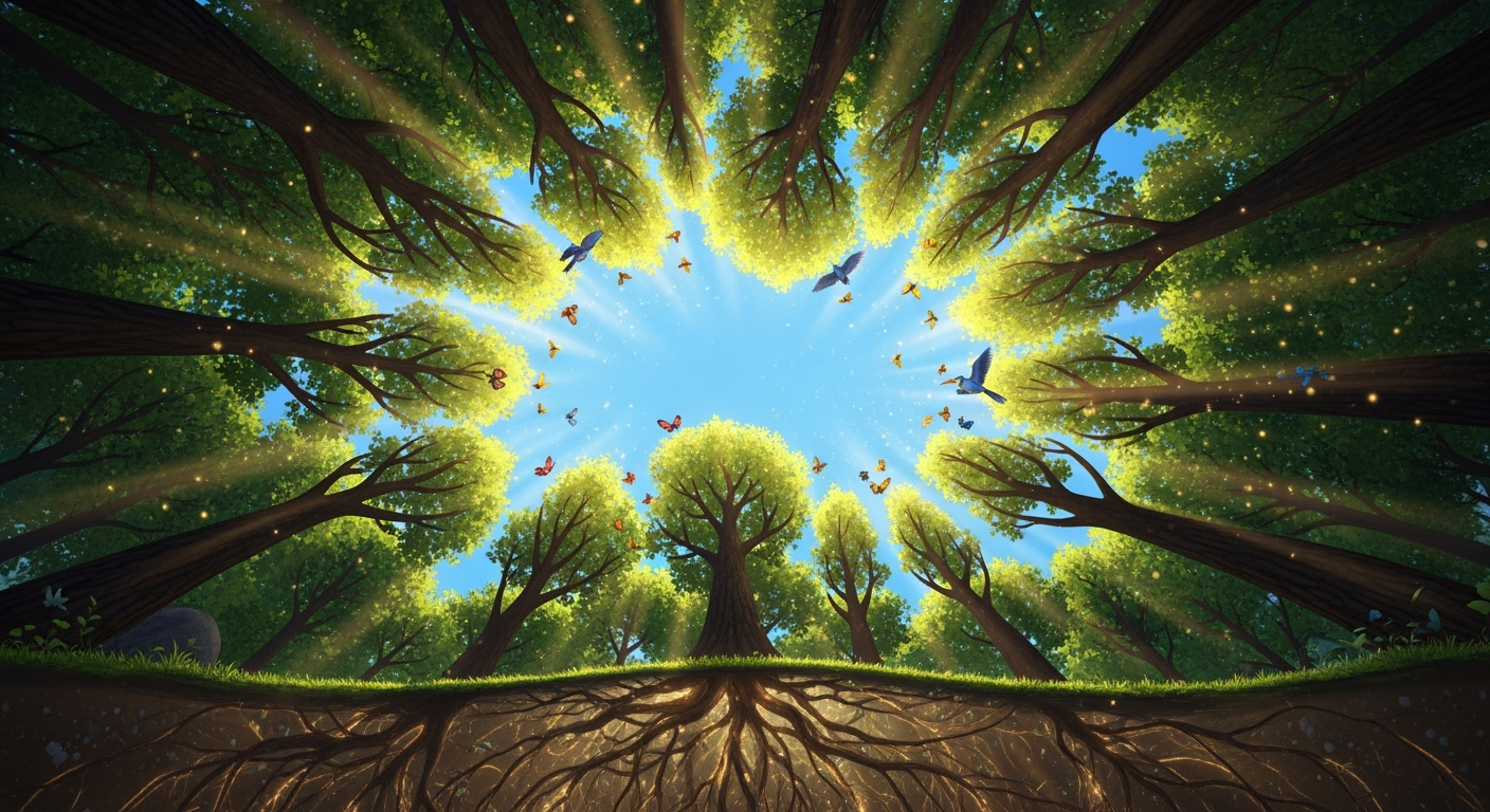 Hast du schon einmal auf einer weichen Wiese gelegen und nach oben in die Baumkronen geschaut? Die grünen Blätter bewegen sich sanft im Wind, Sonnenstrahlen blitzen hindurch wie kleine Lichtschwerte, und vielleicht hüpft ein Eichhörnchen von Ast zu Ast. Aber hast du jemals bemerkt, dass zwischen den Ästen verschiedener Bäume immer kleine Lücken bleiben? Sie berühren sich fast nie!