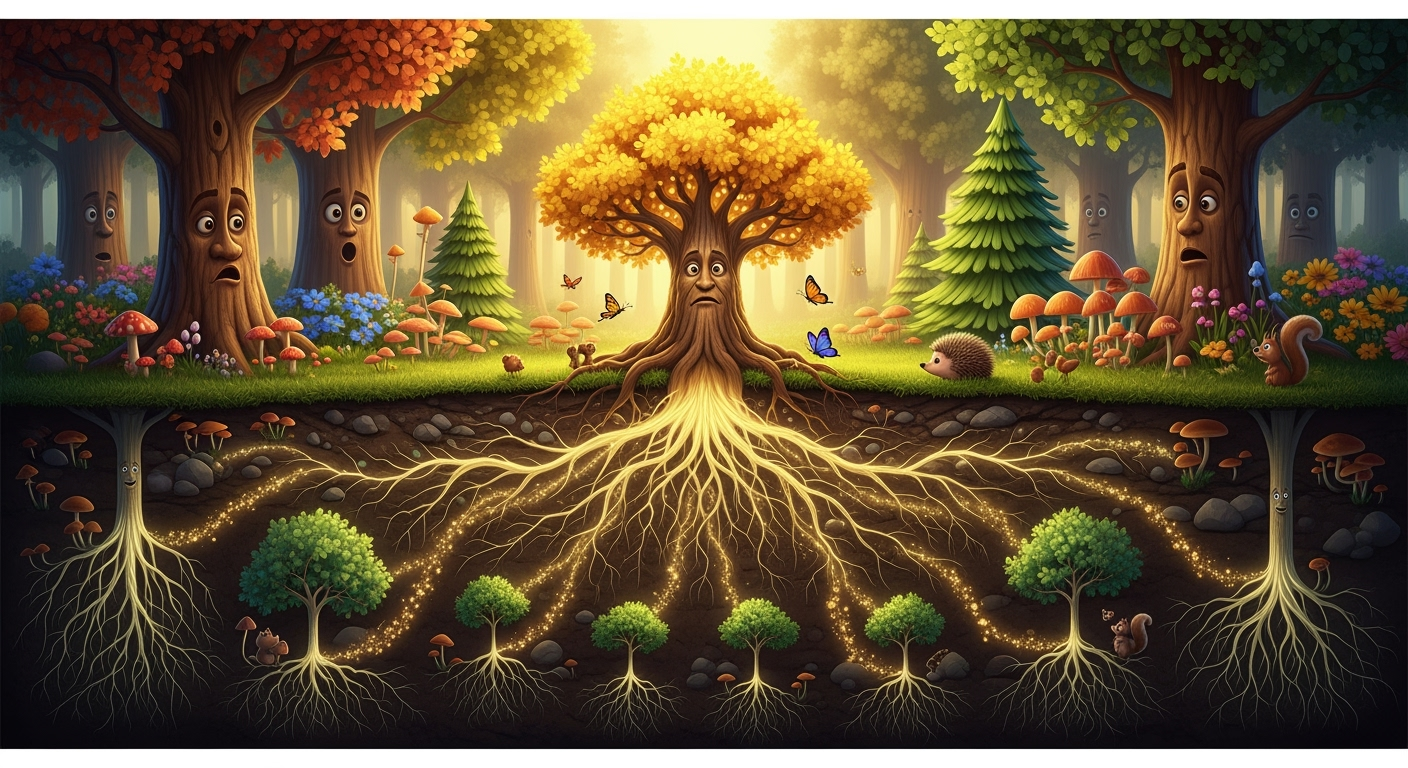 Das nächste Mal, wenn du einen Baum siehst, denk daran: Er ist nicht allein. Er ist Teil eines riesigen Freundschaftsnetzwerks, das unter der Erde pulsiert, teilt und „spricht“.