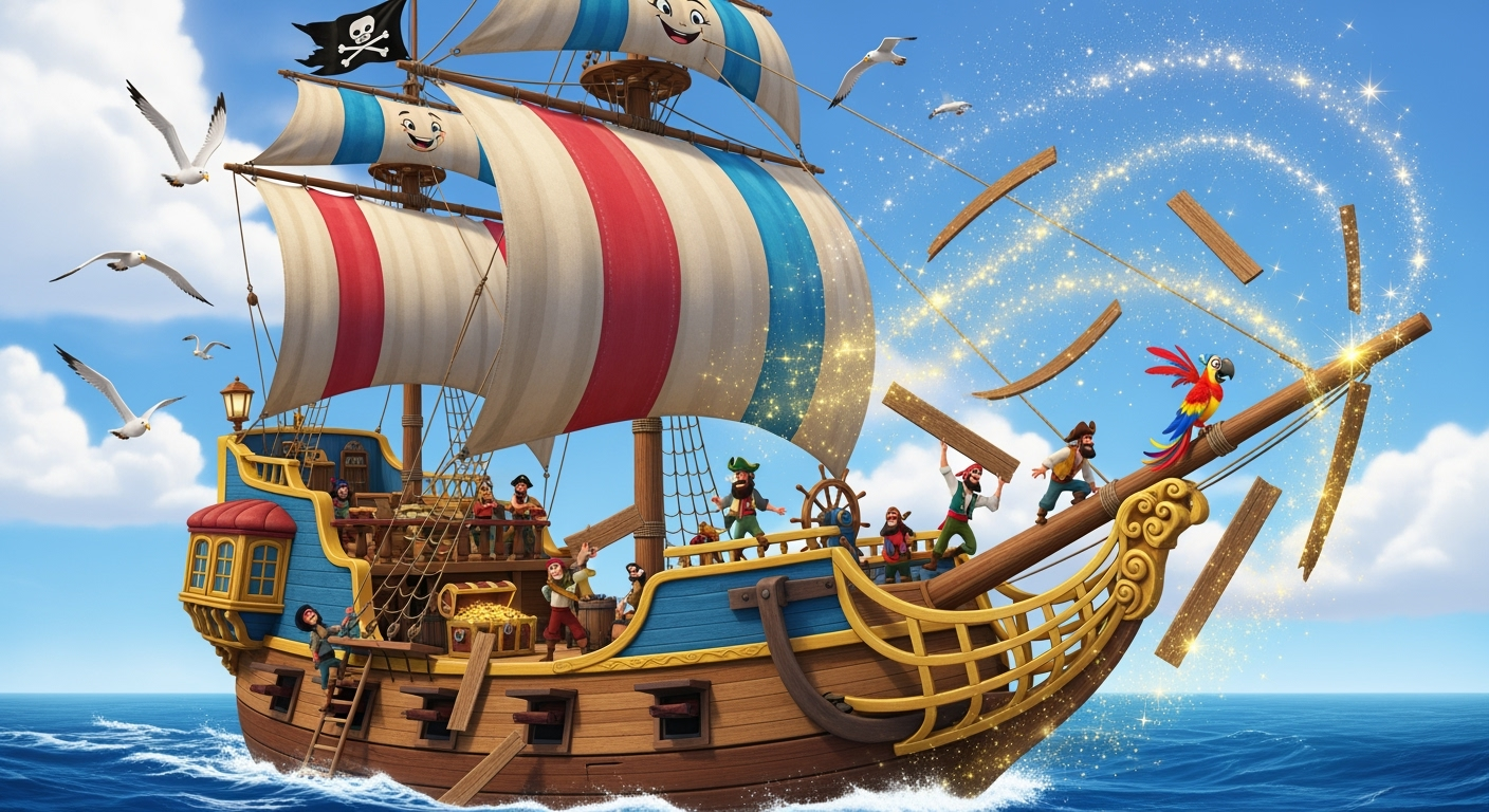 Aber dieses Schiff ist ganz besonders. Während es über die Wellen gleitet, passiert etwas Seltsames: Die Piraten tauschen eine kaputte Holzplanke aus. Dann noch eine. Und noch eine…