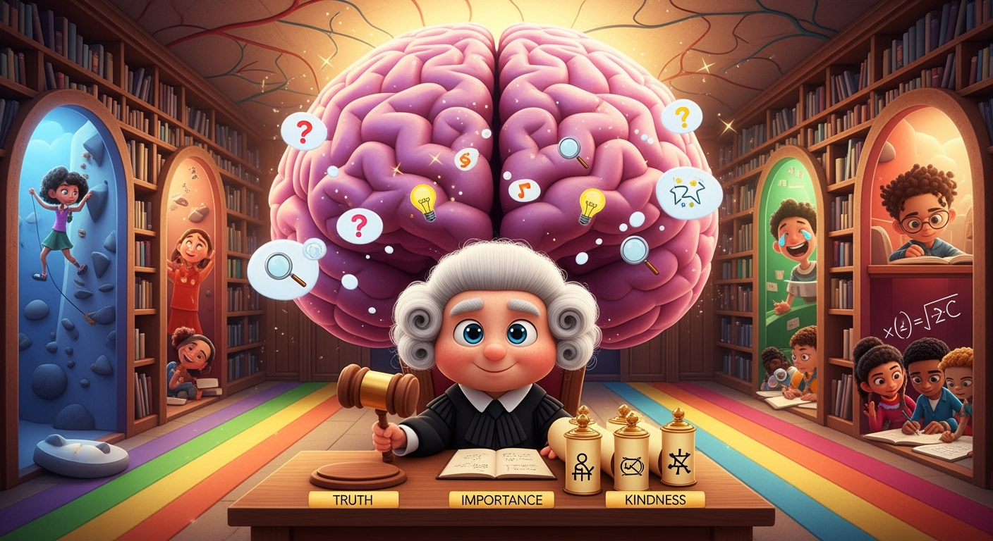 Stell dir vor, in deinem Kopf sitzt ein kleiner, schlauer Richter mit einer lustigen Perücke und einem winzigen Holzhammer. Immer wenn du etwas hörst oder liest, klopft er mit seinem Hammer und fragt: „Moment mal! Ist das wirklich wahr?“ Das ist dein Gedankenrichter! Er ist wie ein Wahrheitsdetektiv, der dir hilft, nicht alles sofort zu glauben, was du hörst.