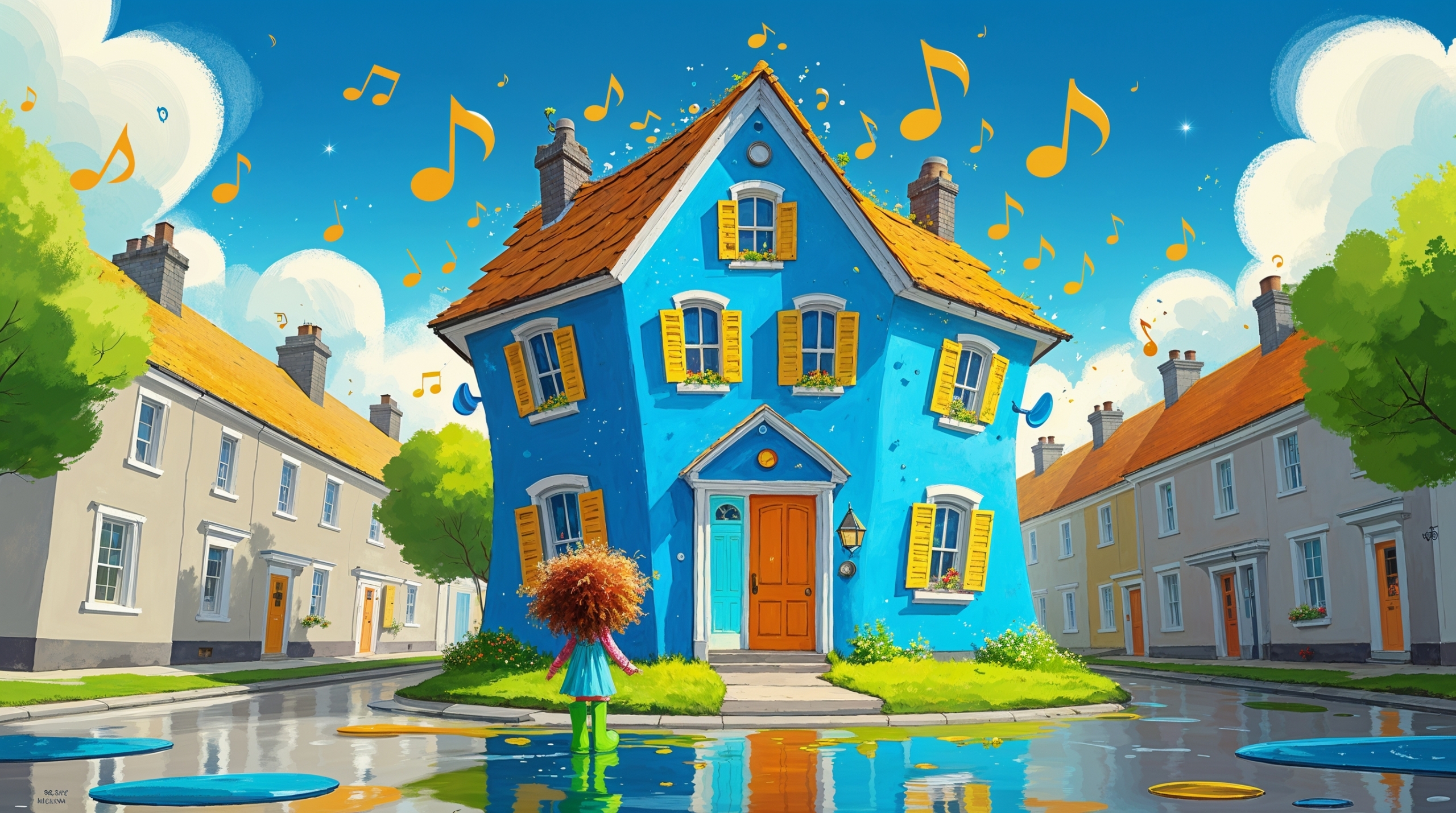 Nach und nach begannen auch andere Häuser zu tanzen – jedes auf seine ganz eigene Weise. Das gelbe Haus an der Hauptstraße schaukelte sanft wie in einer Ballade. Das grüne Haus neben der Schule hüpfte fröhlich auf und ab, während das rote Eckhaus elegant seine Fensterläden im Takt schwang.