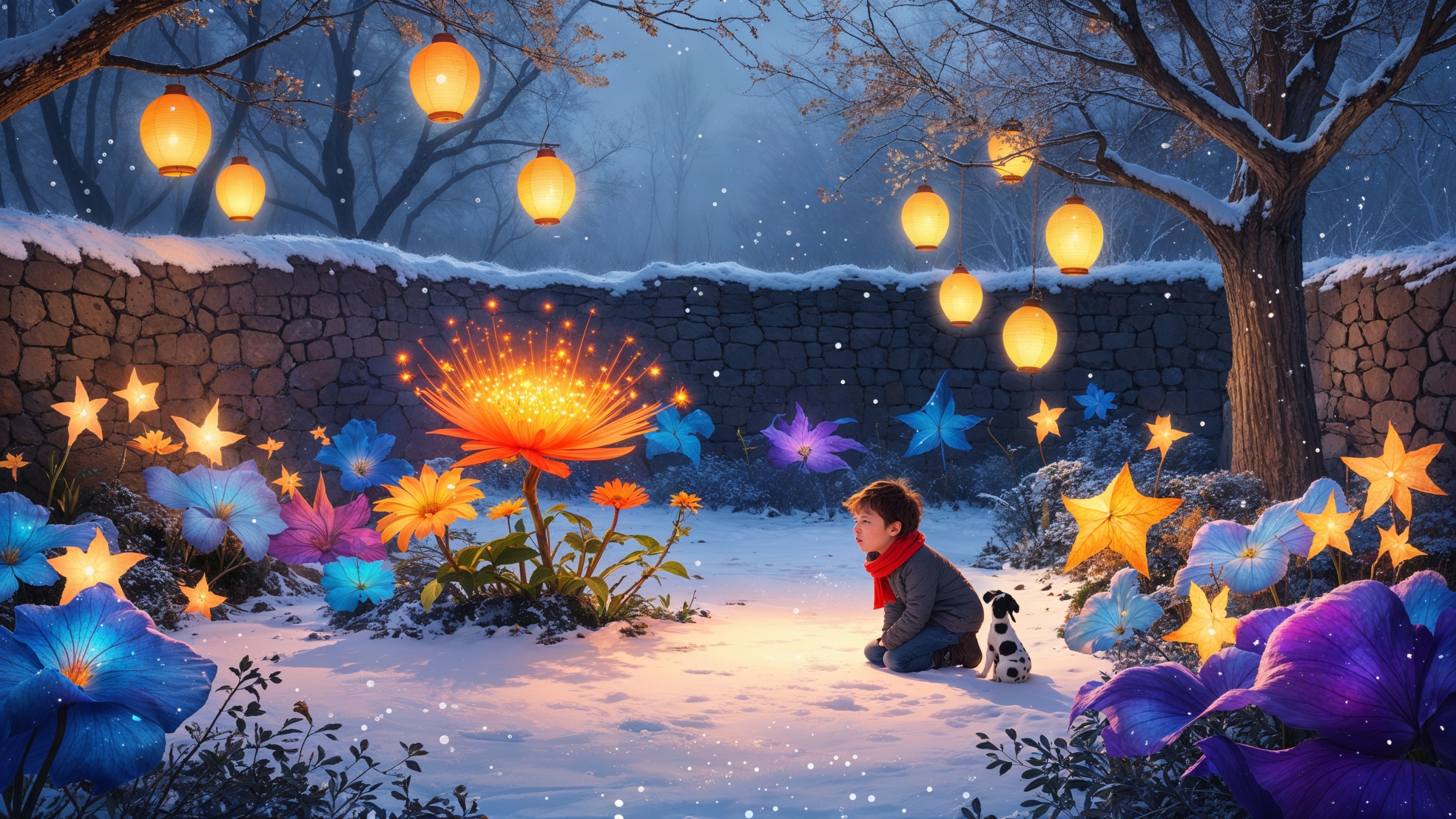 Was Leon dahinter sah, ließ ihn den Atem anhalten. Mitten im tiefsten Winter blühte hier ein Garten voller Leben! Zwischen verschneiten Wegen wuchsen Blumen in Farben, die er noch nie gesehen hatte – leuchtend blau wie der Sommerhimmel, sanft violett wie die Dämmerung und strahlend gelb wie die längst vergessene Sonne. Kleine Laternen hingen in den Zweigen der Bäume und tauchten alles in ein warmes, goldenes Licht. Die Luft roch nach Erde und Leben, nicht nach Schnee und Kälte.