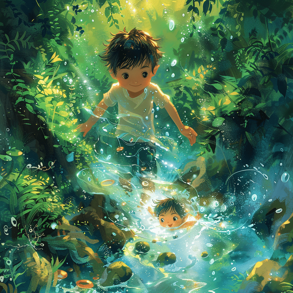 „Folge mir“, sagt Plitschi, während sie eine magische Luftblase erschafft, die Ben atmen lässt, während sie gemeinsam in die Tiefen des Flusses eintauchen.