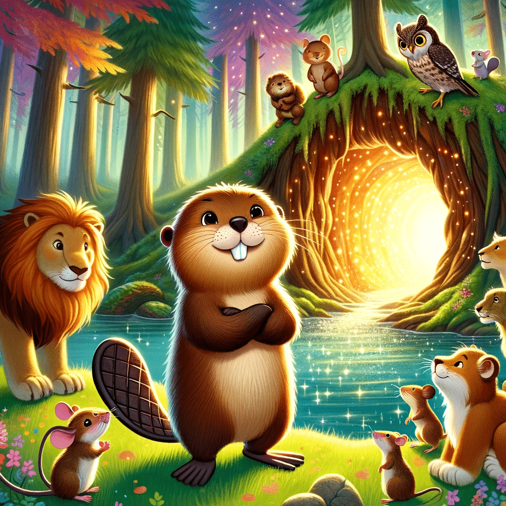 In einem zauberhaften Wald, wo Bäume in den leuchtendsten Farben des Regenbogens erstrahlten und Bäche wie sanfte Melodien plätscherten, lebte der kleine Biber Benji. Benji war ein zierliches, sanftmütiges Tier mit einem Fell, das im Sonnenlicht glänzte wie fließendes Gold. Seine Stimme jedoch war so leise wie das Flüstern des Windes, kaum hörbar über das fröhliche Geplapper der anderen Waldbewohner.
