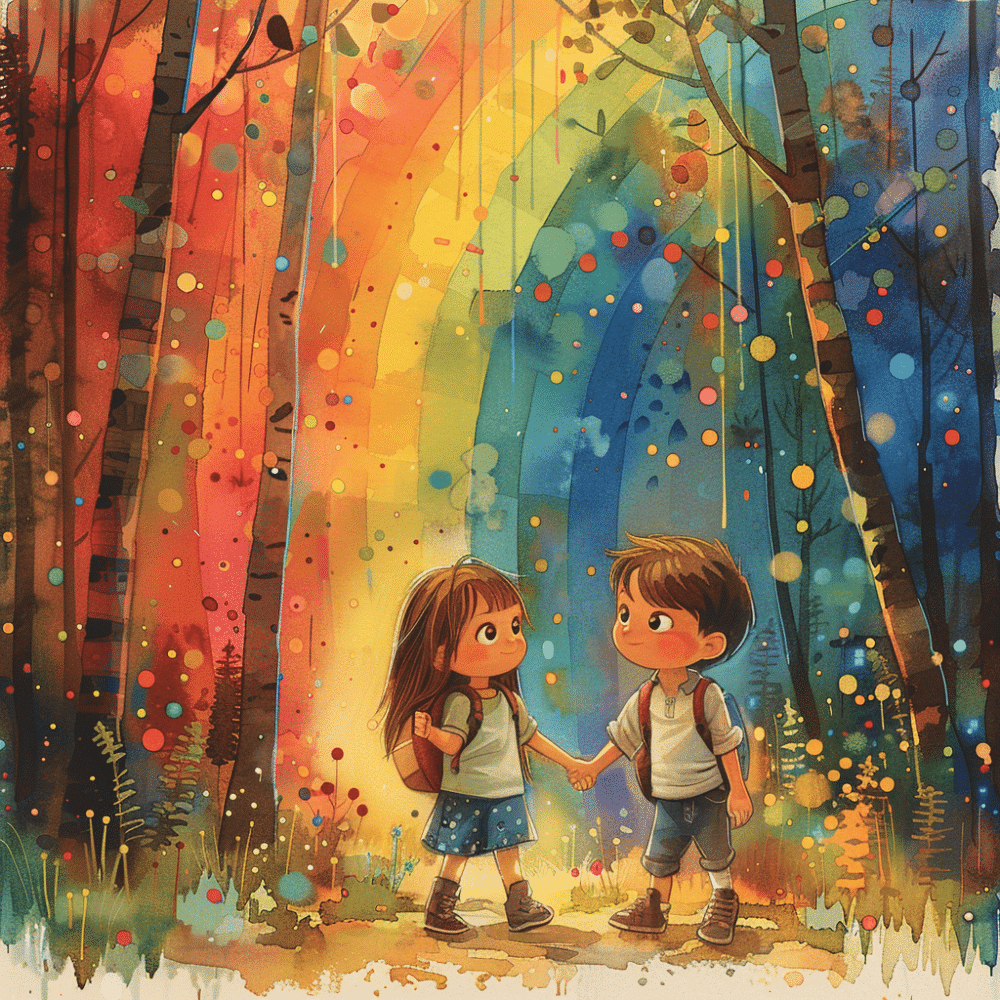 Mit einem festen Versprechen aneinander machten sich die beiden Freunde auf den Weg. Sie liefen durch das Dorf, über Felder, und bald erreichten sie den Wald, in dem der Regenbogen auf den Boden zu treffen schien.