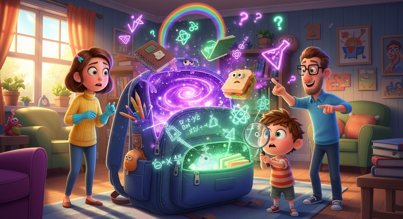 Für Kinder ist alles ganz logisch. Der Schulranzen ist ein Portal zu anderen Dimensionen! Dort leben die verschwundenen Stifte in Frieden zusammen. Das vergessene Pausenbrot erforscht neue Lebensformen. Und das Matheheft? Das ist in die Parallel-Dimension gerutscht, wo Mathe endlich Sinn ergibt!