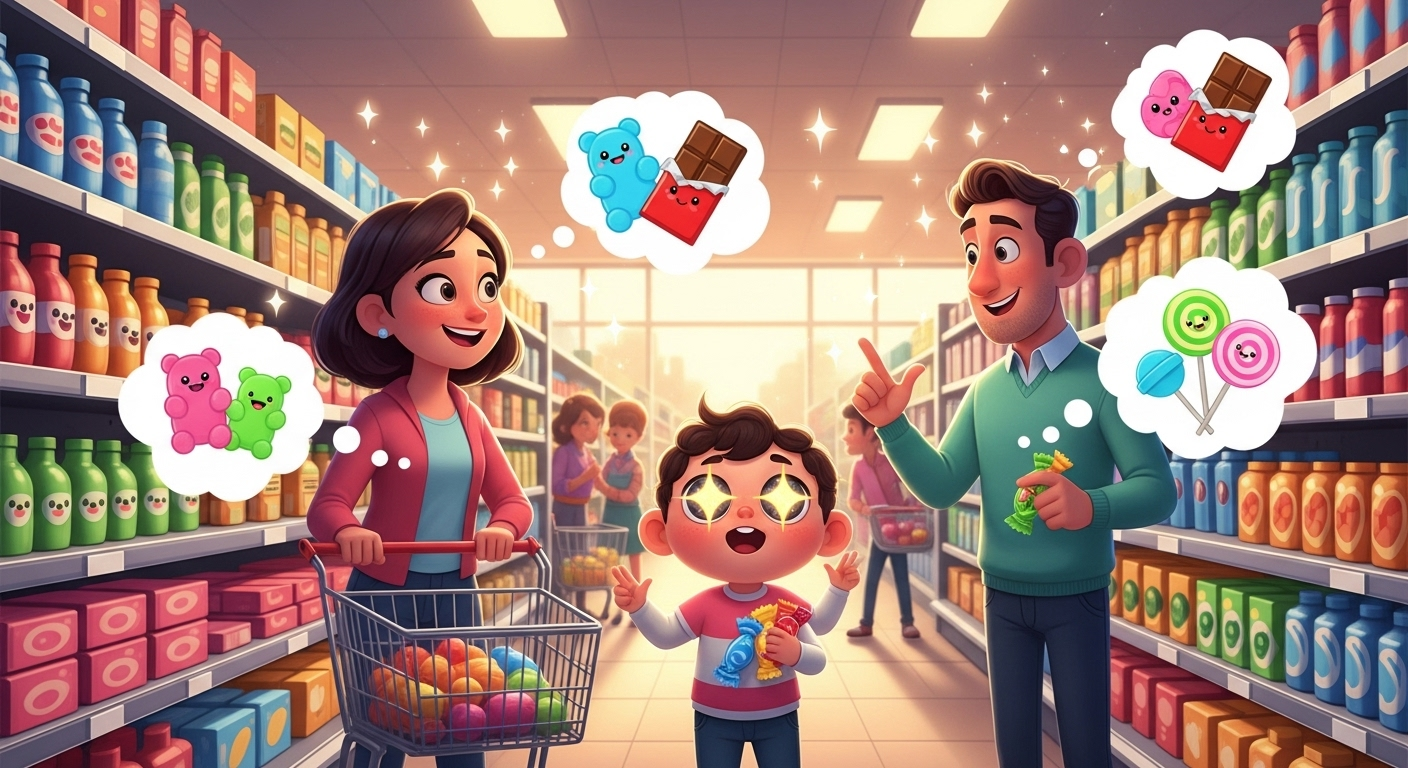 Während Mama versucht, ihrer Liste treu zu bleiben, formiert sich das Team Verhandlung. Papa und Kind vereinen ihre Kräfte gegen die Macht der vernünftigen Einkäufe. Es ist wie David gegen Goliath, nur dass David süße Zähne hat!