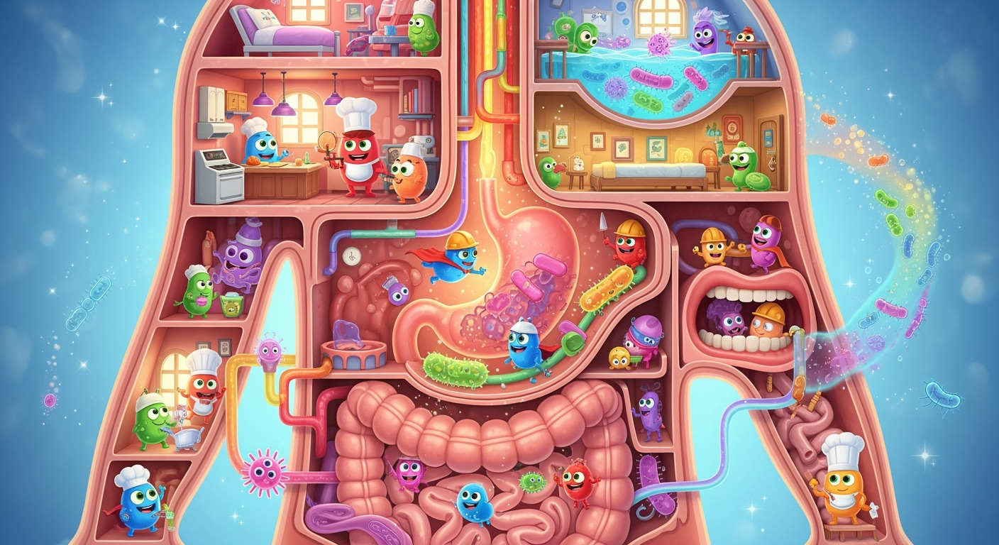 Stell dir vor, dein Körper ist ein riesiges Haus mit vielen Zimmern. Du bist der Hauptbewohner, aber du teilst dein Zuhause mit Billionen winziger Mitbewohner. Ihr helft euch gegenseitig: